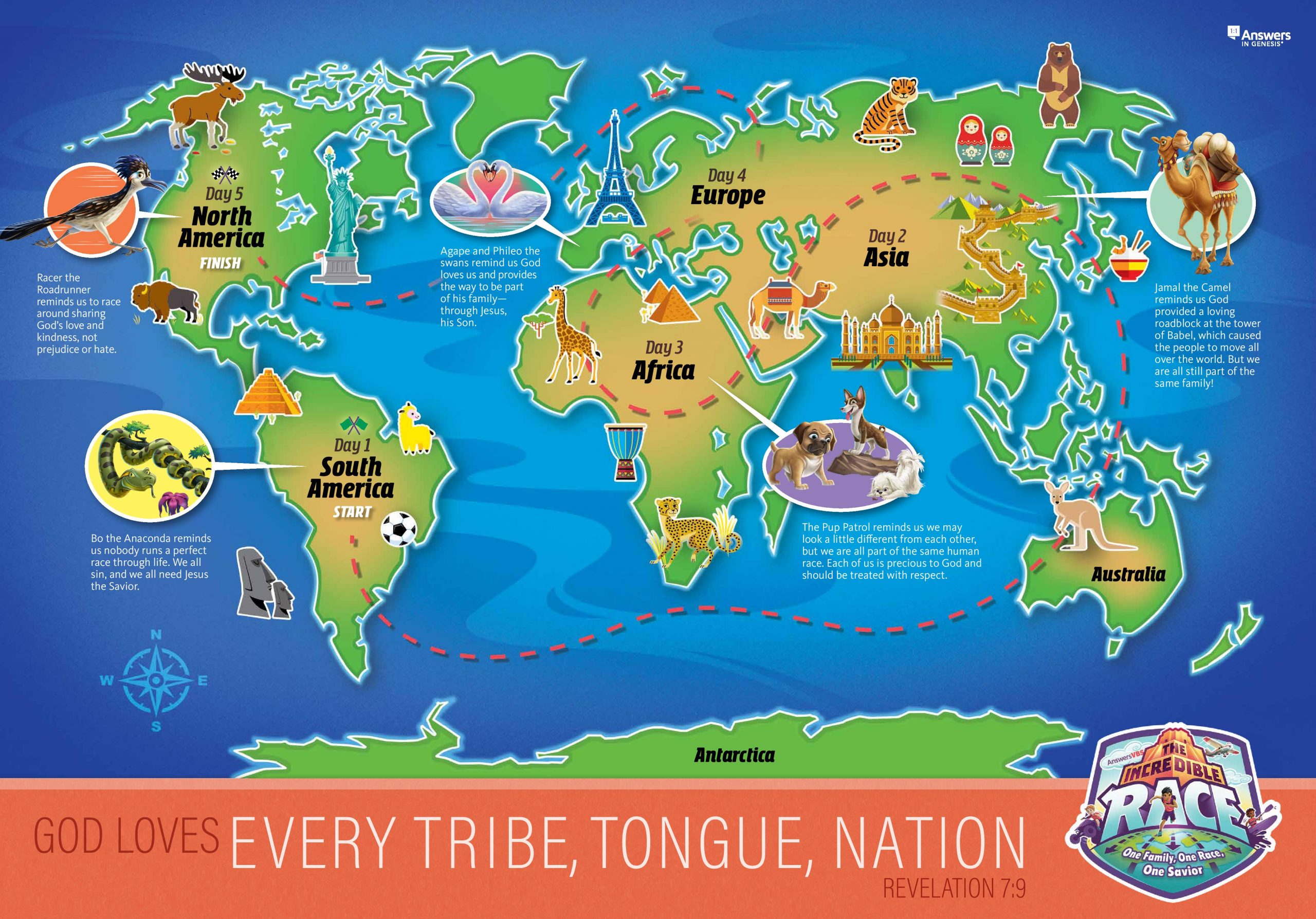 At this VBS, your kids will explore the biblical answers to these questions as they set off on an epic adventure from Genesis to Revelation. Amid sloths, butterflies, river dolphins, and dart frogs, your children will sail along on a fun jungle cruise, stopping at seven ports of call. These ports are the 7 C’s of History: Creation, Corruption, Catastrophe, Confusion, Christ, Cross, and Consummation. Kids will discover how these events shape our world, and they will learn to reconnect the Bible to their everyday life.